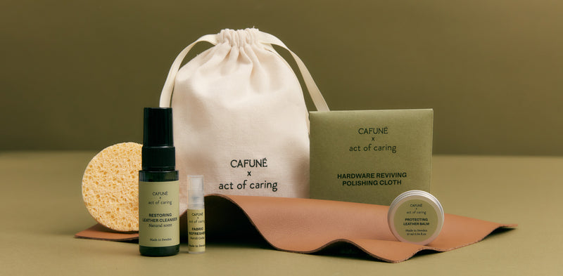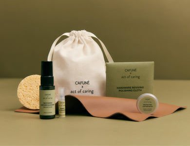 為了讓您的 Cafuné 包款能長年陪伴您,我們特別推出了 Cafuné x Act of Caring 皮革保養組合。這套精心設計的組合,能幫助您輕鬆保護包款的天然皮革特性。